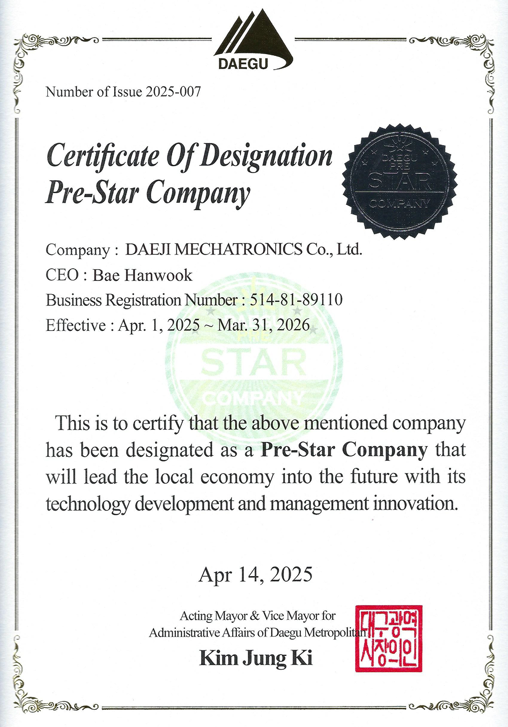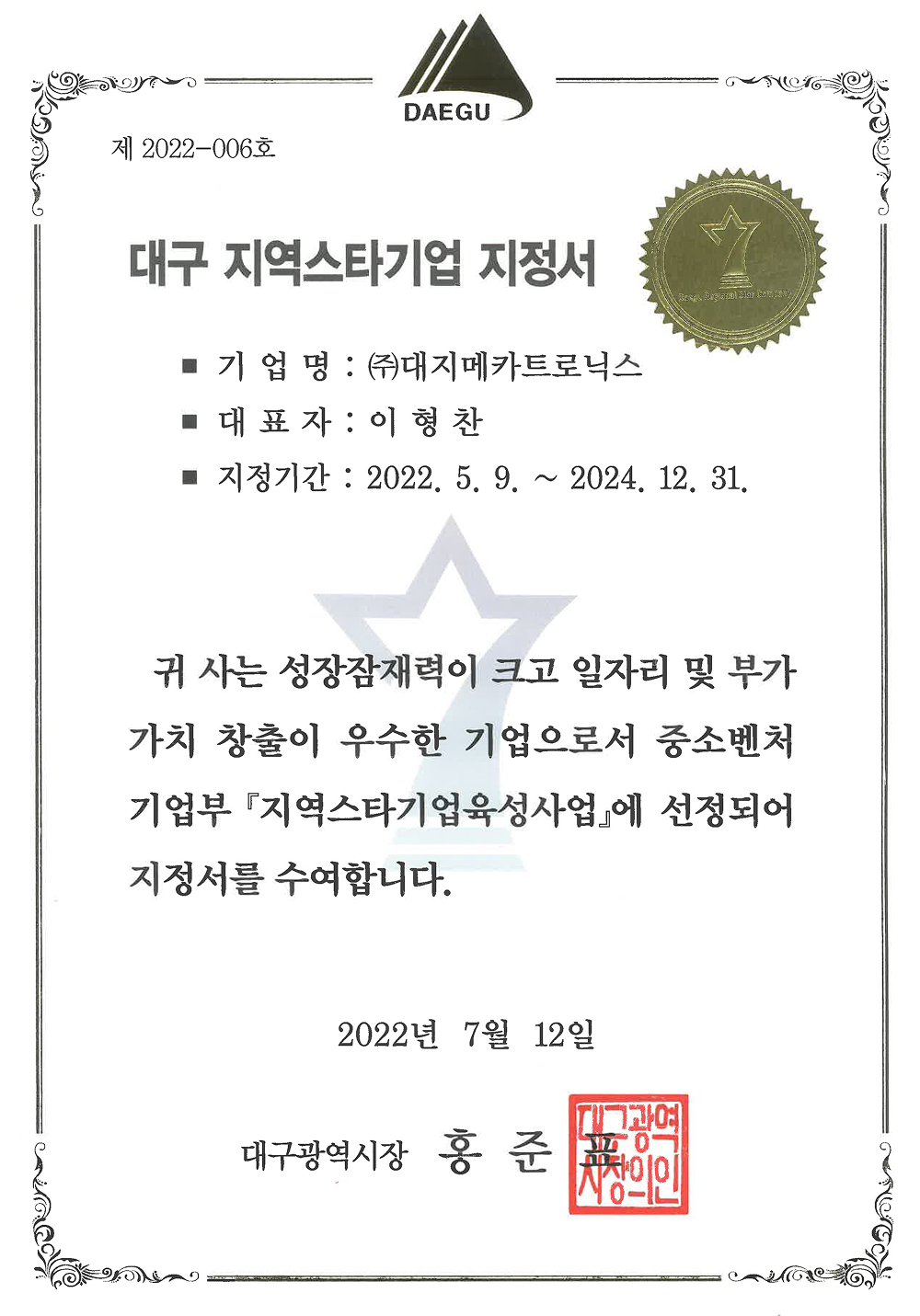 대구지역스타기업 지정서