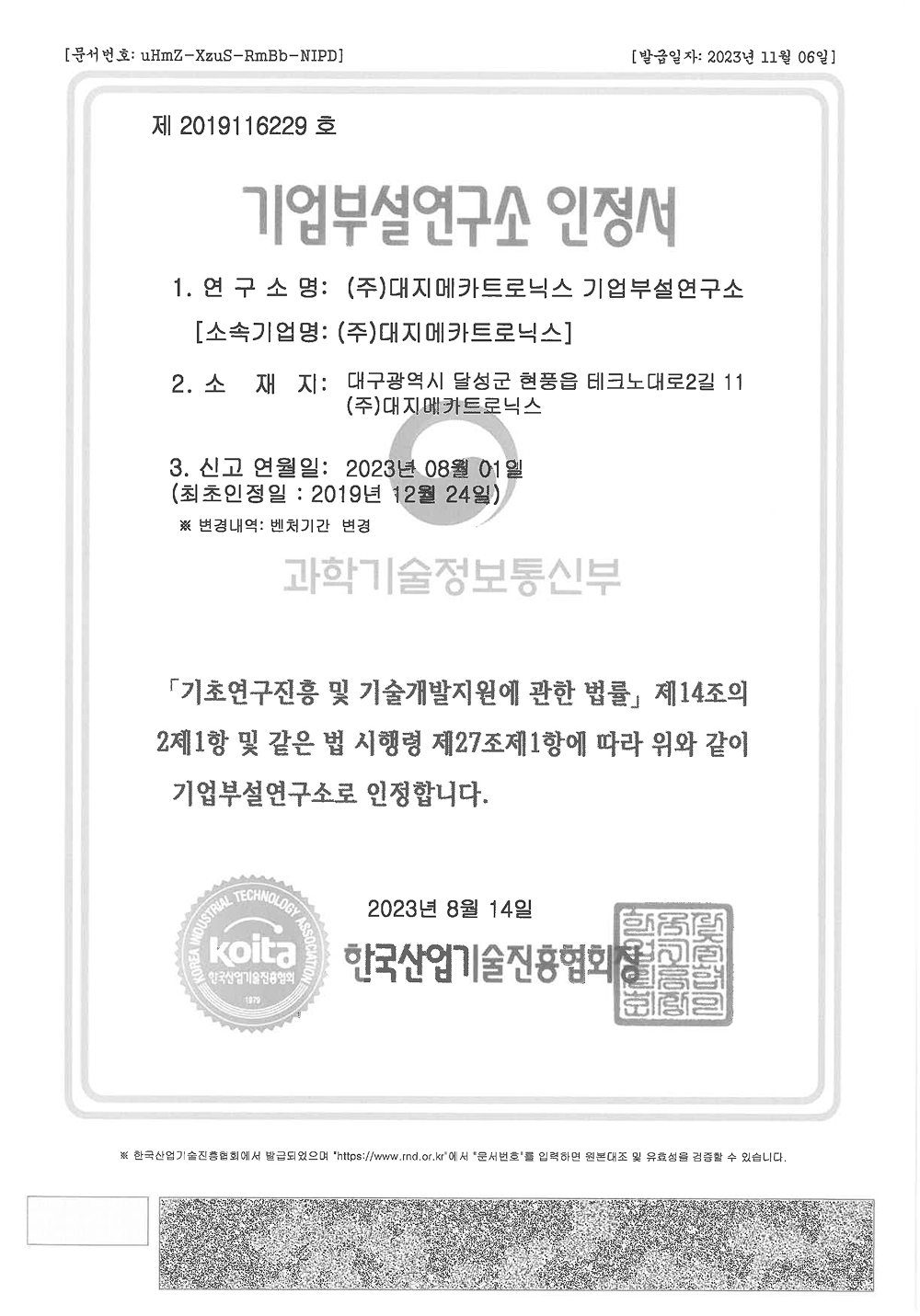 기업부설연구소 인정서
