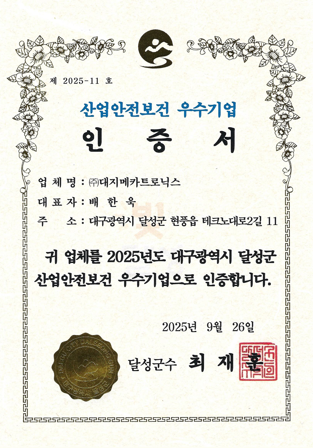 산업안전우수기업 인증서