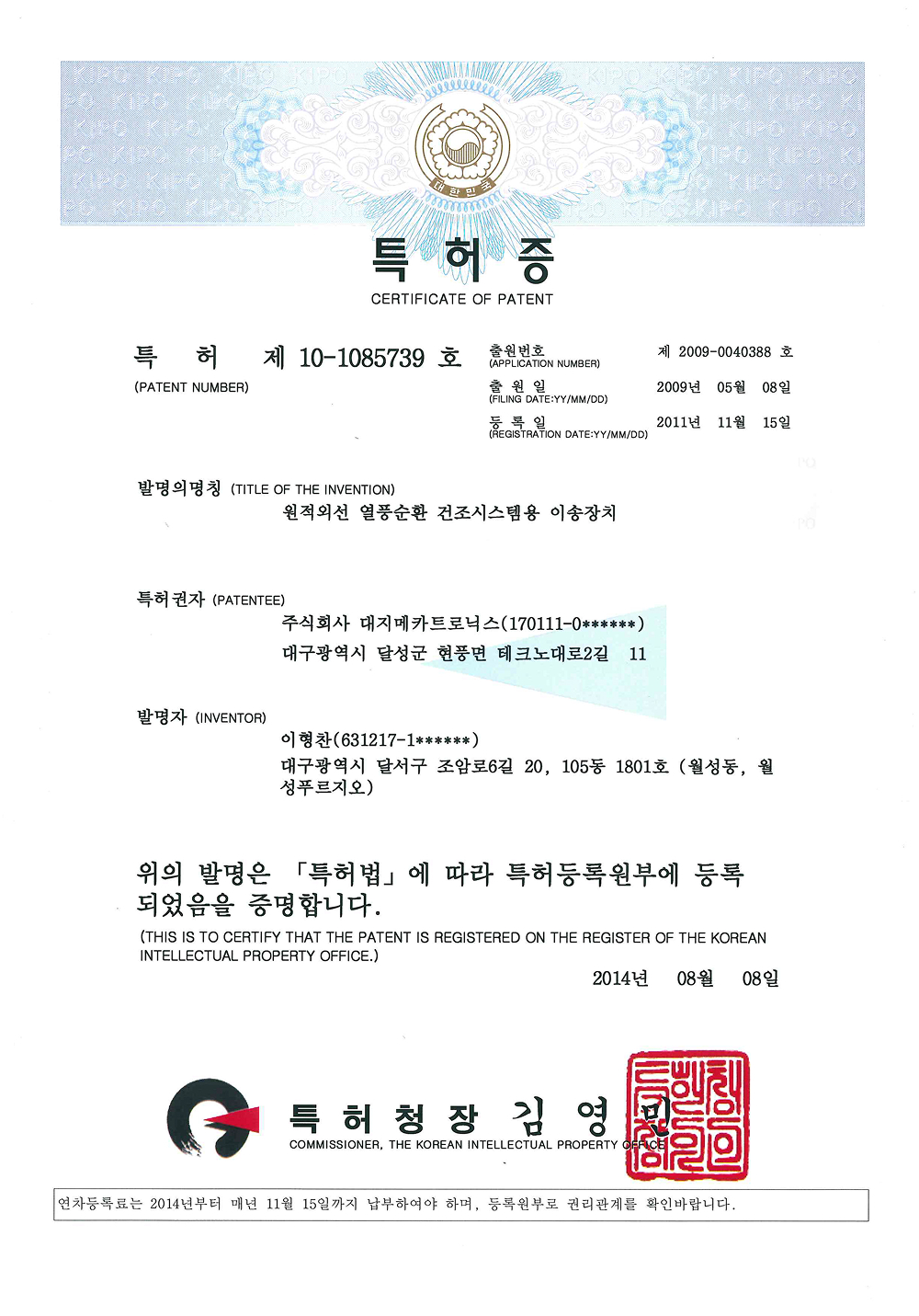 원적외선열풍순환건조시스템용이송장치 특허증